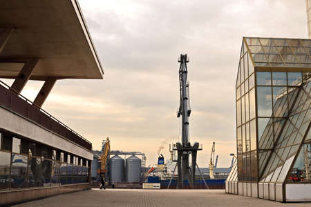 Giant harbor portal gantry cranes and many Intermodal containers stand in the Port of Odessa on the Black Sea coast at Sunset. Odessa, Ukraine