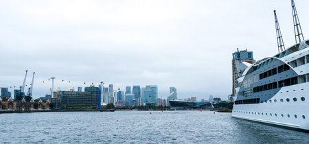 London, England - 25 March 2017 : Panorama of Canary Wharf commercial buildings as seen from the river Thames, London, UK