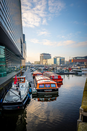 Docklands waterfront promenade with high rise buildings and docked yachts