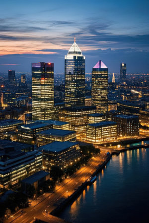 Aerial view of Rotterdam cityscape at sunset, Holland