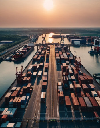 A stunning aerial viewpoint capturing a bustling container port at sunset, featuring multiple cranes and rows of colorful shipping containers along the harbor.