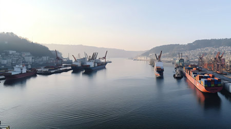 Aerial view at dawn shows a bustling commercial port with neatly stacked containers and cranes ready for action. The tranquil waters reflect the soft morning light. Industrial activity. Generative AI.