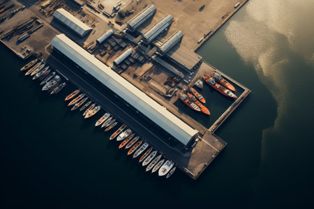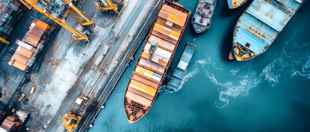 An overhead view reveals cargo ships docked at a harbor. Containers are stacked, indicating import and export activities. The scene is lit by natural light, showing various colors. This image would be suitable for commercial projects illustrating logistics, transportation, or global commerce.