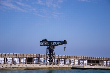 Lifebuoy ring on berth near the bollard with sea view of Marina Mariupol, Ukraine outdoors
