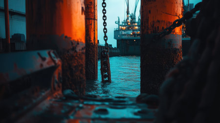 Close-up of a container ship at an industrial port at dusk, with lights starting to illuminate the scene as cranes continue their work. Highlights evening port activity.