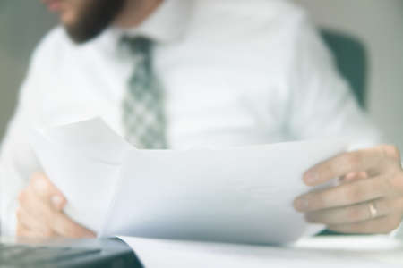 Crop close up of paper contract on table in office, ready to sign close deal. Paperwork official document or agreement before employee or worker signature. Business letter, legislation concept.