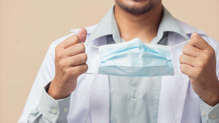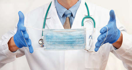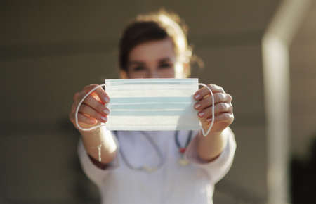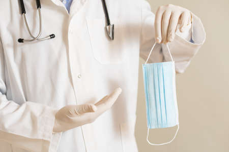 COVID-19. Doctor or nurse holding face surgical mask. Stop the virus spread, Protect yourself and others, and Help Hospitals with supplies and equipment for patient care and health worker safety.
