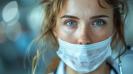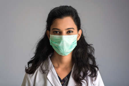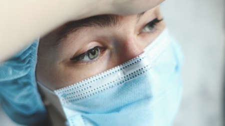 Closeup portrait of a young girl or woman doctor wearing a medical or surgical mask