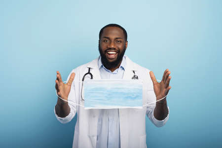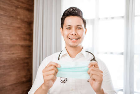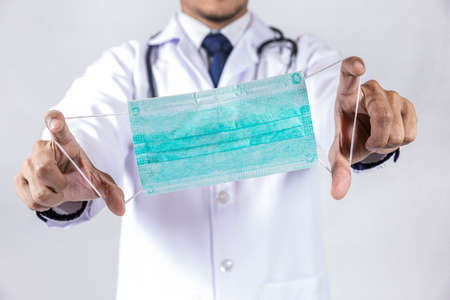 doctor in white medical coat and blue gloves shows you how to put on mask. concept of protection from the virus covid-19