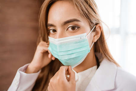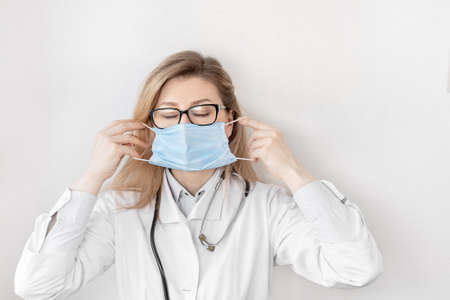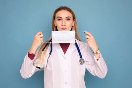 Portrait of a young female doctor who puts on a protective mask on a blue background