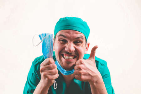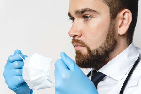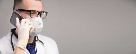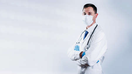 Doctor in a blue mask on a white background. Copy space. Banner.