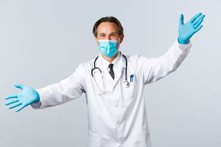 Covid-19, preventing virus, healthcare workers and vaccination concept. Friendly doctor in medical mask and gloves spread hands welcoming, greeting clinic patients, inviting come in