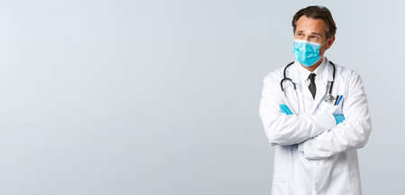 Covid-19, preventing virus, healthcare workers and vaccination concept. Troubled thinking doctor in medical mask and gloves, looking upper left corner concerned, pondering decision