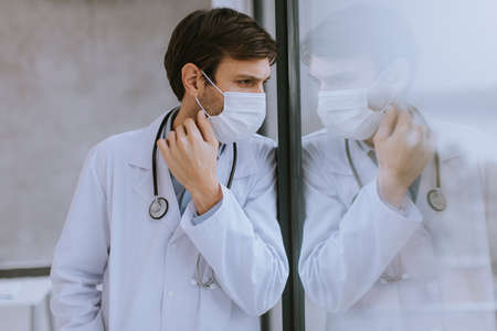 Handsome male doctor looking away with worry, frustration, tiredness and exhausting feelings