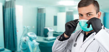 Caucasian man posing as a medical doctor in white overall or scrub with stethoscope around a neck and black gloves. Putting on protective face mask. Hospital beds in the background. Large copy space on the left.