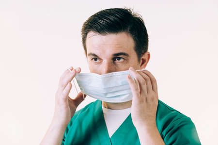 The doctor in protective gloves puts on a protective mask. Healthcare concept