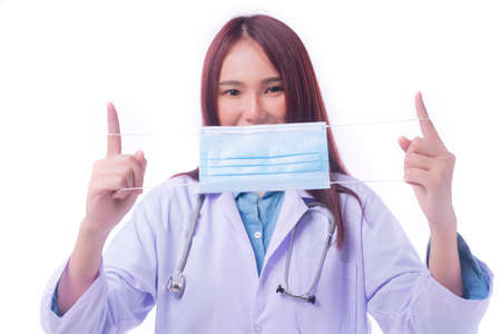 Professional young woman doctor in uniform white clothes with stethoscope while showing medical mask protection from inhaling airborne bacteria or virus disease on nose over isolated white background.