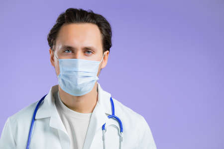Portrait of doctor in professional medical coat and facial mask. Man doc isolated on purple background. Medical staff concept.
