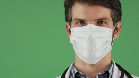 Sliding cropped portrait of a male doctor wearing protective medical mask posing confidently on green chromakey background. Medical worker in a mask smiling joyfully.