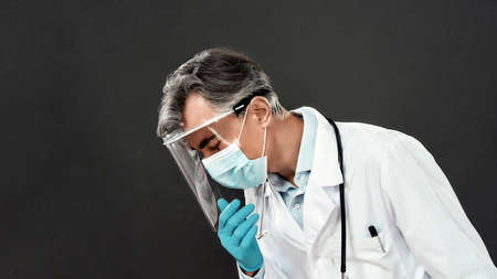 Stop Covid19. Side view of a mature male doctor in medical mask and blue gloves wearing face shield while standing against dark background