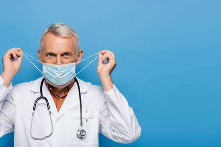 middle aged doctor in white coat adjusting medical mask isolated on blue