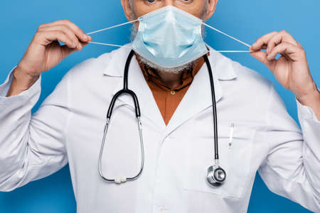 cropped view of middle aged doctor in white coat adjusting medical mask isolated on blue