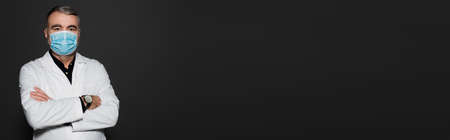 doctor in medical mask standing with crossed arms and looking at camera isolated on black, banner