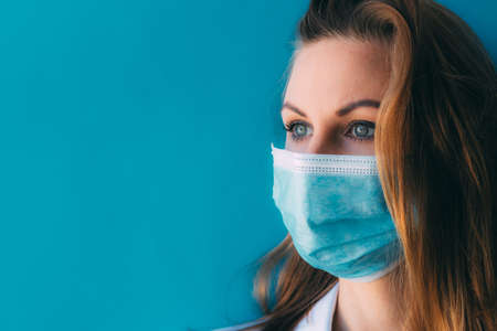 Close-up part profile portrait of young female doctor in medical cap, mask on blue background with space for text. Female doctor in clinic. Coronavirus epidemic pandemic, covid-19. Stay home concept