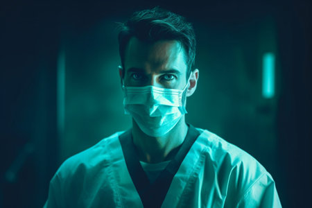 Adult handsome doctor at medical mask and smock tasting light at the operation room copy space : Generative AI