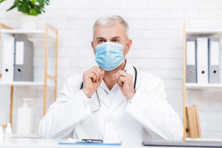 Healthcare workers and modern medicine in coronavirus covid-19 pandemic. Serious calm senior male in white coat puts on protective mask and waits for patient in clinic office interior, copy space