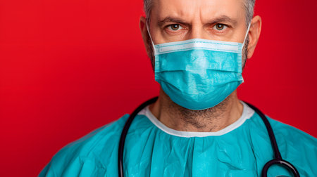 The image features a serious male doctor wearing a blue mask and gown with a stethoscope, set against a solid red background, projecting an atmosphere of determination and care.