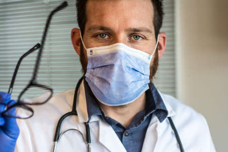 Close up of doctor wearing protection face mask from various pathogens and viruses.