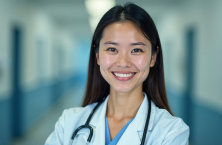 A young female doctor with long black hair smiles confidently in a hospital corridor. She wears a white coat and a stethoscope around her neck, showing her dedication to healthcare. Copy space.