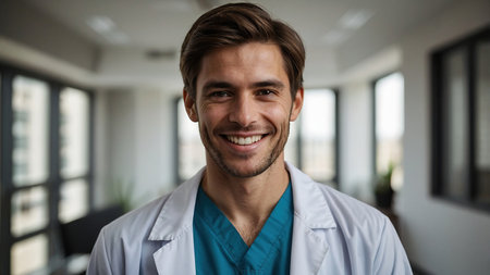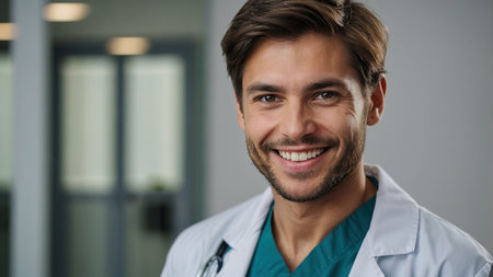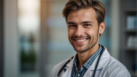 Young male doctor smiling confidently and wearing a stethoscope around his neck, standing in a clinic setting, representing medical professionalism, patient care, and modern healthcare