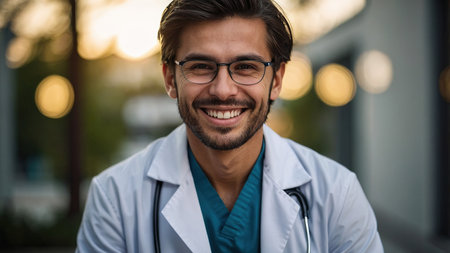 Young male doctor smiling outdoors during sunset in a professional medical coat with a stethoscope around his neck.