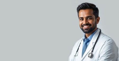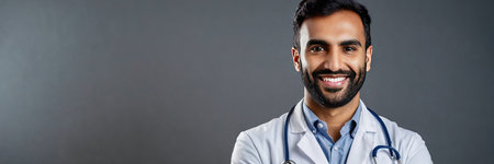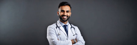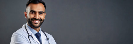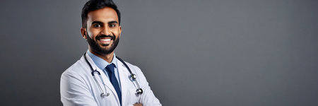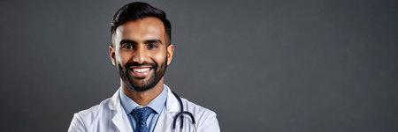 Indian male doctor with stethoscope over gray background. panoramic shot