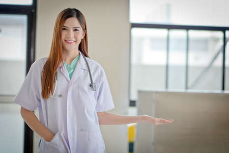 Happy smiling young beautiful female doctor showing blank area for sign or copyspace,The photos from inside the building.