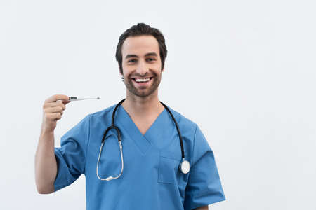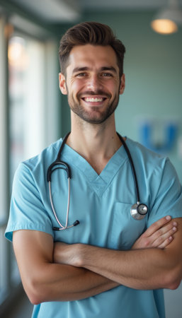 Smiling male doctor in scrubs with stethoscope