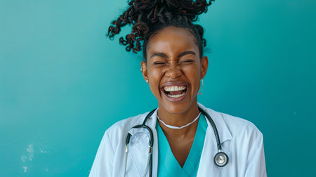 a female doctor is laughing with her eyes closed and a stethoscope around her neck