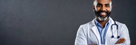 African american male doctor in white coat on gray background. Panoramic banner with copy space.