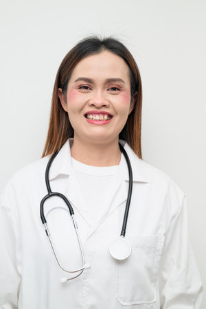 Studio portrait of an Asian healthcare professional wearing a white coat and stethoscope. Concept suitable for medical, hospital, clinic, and healthcare themes.