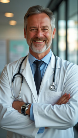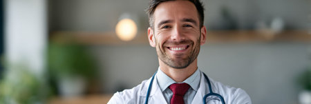 Confident male doctor smiling warmly indoors with a stethoscope