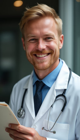 A cheerful male doctor with glasses and a stethoscope stands confidently in a well-lit hospital corridor, holding a tablet. His warm smile radiates professionalism and approachability, embodying the caring spirit of healthcare.