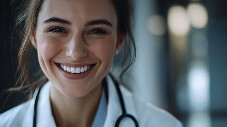 A young woman wearing a white coat and stethoscope smiles warmly in a modern healthcare environment. She is ready to engage and educate about health topics and wellness.