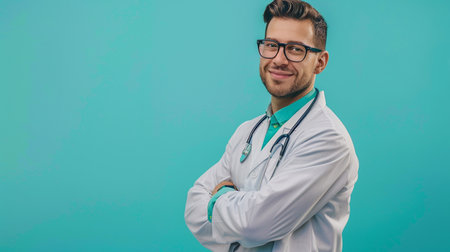 A smiling male doctor in glasses and a lab coat with a stethoscope, arms crossed, standing against a vibrant turquoise backdrop.