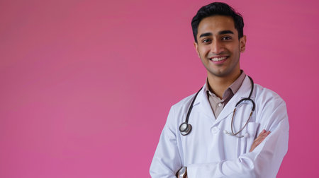 A confident young man, dressed as a medical professional, poses with a stethoscope, embodying healthcare and expertise against a vibrant pink backdrop.