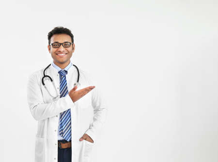 indian male doctor in white coat with stethoscope on grey background