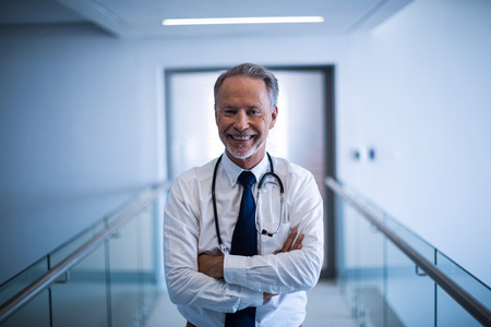 Portrait of senior doctor with stethoscope standing in hospital corridor