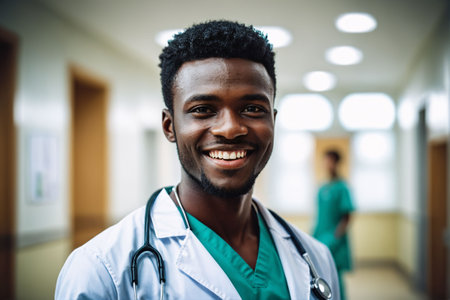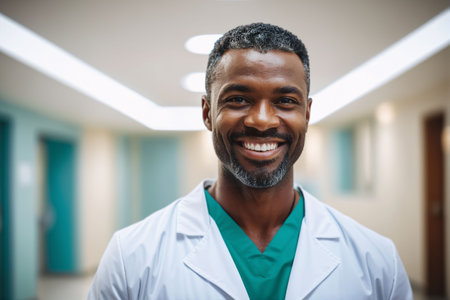 A portrait of a smiling African-American male doctor in a hospital, AI-generated.