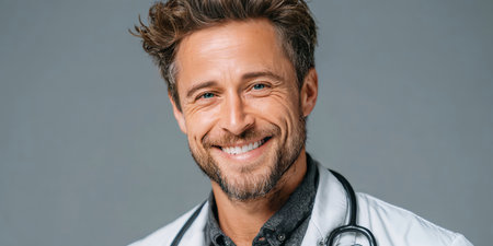 A friendly male doctor with a beard and a stethoscope smiles confidently at the camera. This professional portrait conveys warmth and trustworthiness in a healthcare setting.